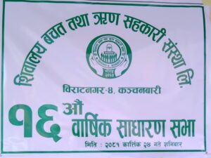 बिराटनगर / कार्तिक २४ / शिवालय बचत तथा ऋण सहकारी संस्थाले आफ्नो १६ औ साधारणसभा आज सम्पन्न गरेको छ । बिराटनगर – ४ स्थित कन्चनबारी माध्यमिक बिद्यालय प्राङ्गणमा सो सभाको आयोजना गरिएको हो । सो अवसरमा संस्थाका अध्यक्ष यशबहादुर क्षेत्रीले आ.ब. २०८०/८१ को आय-ब्यय र २०८१/८२ का लागि नीति तथा कार्यक्रम प्रस्तुत गर्नुभयो भने लेखा […]