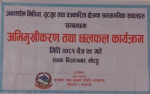 बिराटनगर / चैत ३१ / सञ्चार तथा सूचना प्रबिधि मन्त्रालयले गत चैत २९ गते अनलाइन मिडिया, युट्युब, तथा पत्रकरिता क्षेत्रका समसामयिक बिषयमा एकदिने अभिमुखिकरण तथा छलफल कार्यक्रम बिराटनगरमा सम्पन्न गरेको छ । मोरङका सम्बन्धित पत्रकारहरुको उल्लेख्य सहभागिता रहेको सो कार्यक्रम युट्युब, अनलाइन र फेसबुकको व्यापक प्रयोग तथा लोकप्रियताको बर्तमान परिप्रेक्षमा अत्यन्त उपयोगी देखिएको छ । […]