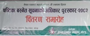 बिराटनगर / बैशाख २० / यस बर्षको षष्टिका बस्नेत सूचनाको अधिकार पुरस्कार आज आयोजित एक विशेष कार्यक्रमका बीच अन्नपुर्ण पोष्टका ब्युरो प्रमुख किशोर बुढाथोकीलाई प्रदान गरिएको छ । त्यसैगरी षष्टिका बस्नेत सूचनाको अधिकार प्रोत्साहन पुरस्कार झापाका सुरेन्द्र भण्डारीलाई प्रदान गरिएको छ । बिश्व प्रेस स्वतन्त्रता दिवसको अवसर पारेर नेपाल पत्रकार महासंघ, मोरङ शाखाले आयोजना गरेको […]