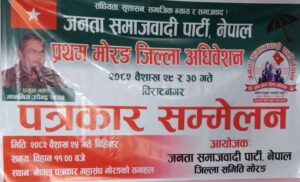 बिराटनगर / २०८२ बैशाख २५ / उपेन्द्र यादव नेतृत्वको जनता समाजबादी पार्टी, नेपालको प्रथम मोरङ जिल्ला अधिबेशन यही बैशाख २९ र ३० गते बिराटनगरमा हुने भएको छ । पार्टीका तर्फबाट आज पत्रकार सम्मेलन गरि जिल्ला अध्यक्ष राजकुमार यादबले उक्त जानकारी दिनुभएको हो । बीरगन्ज महाधिबेशन पछि “जनतासग जसपा नेपाल” भन्ने राष्ट्रिय अभियान सहित अगाडि बढेको […]