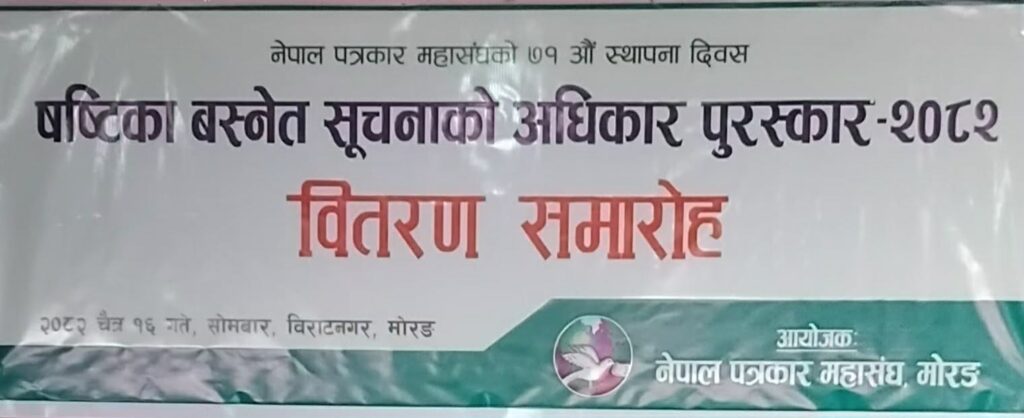 बिराटनगर / २०८२ चैत्र १६ / यस बर्षको “षष्टिका बस्नेत सूचनाको अधिकार प्रोत्साहन पुरस्कार” नेपाल पत्रकार महासंघ, धनकुटा शाखाका सचिब तथा अन्नपुर्ण पोष्ट दैनिकका पत्रकार हरिबहादुर लम्जेललाई प्रदान गरिएको छ । कोशी प्रदेशका आन्तरिक मामिला तथा कानून मन्त्री इन्द्रमणी पराजुलीले लम्जेललाई सो पुरस्कार र प्रमाणपत्र प्रदान गर्नु भएको हो । सो पुरस्कारको राशी रु. २५०२५/= रहेको छ ।