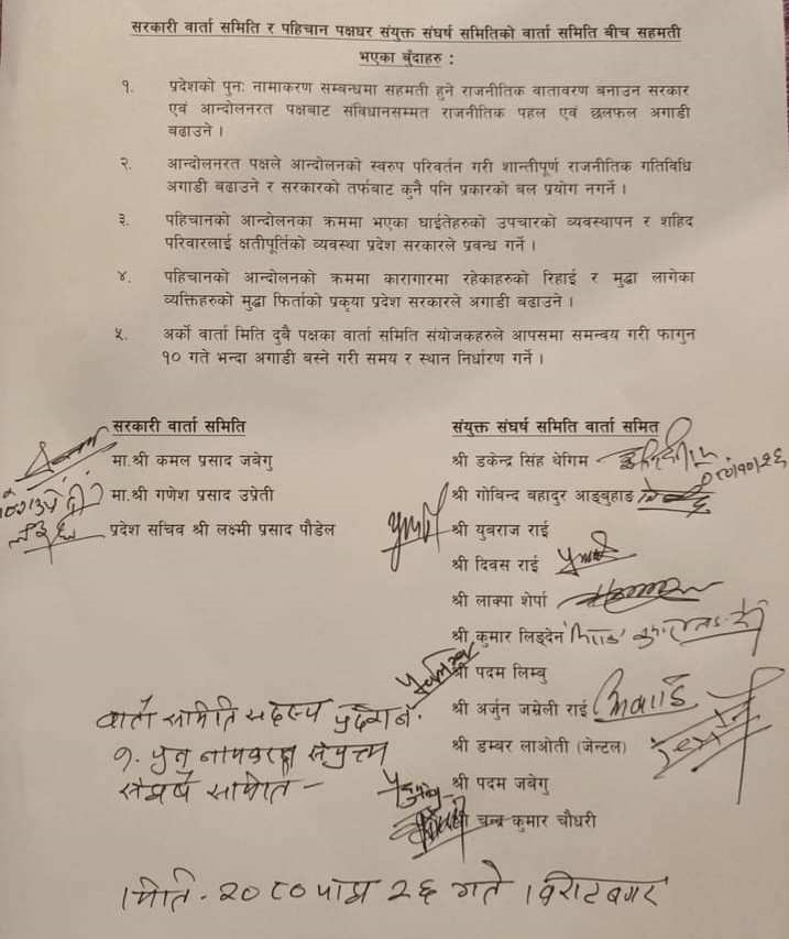 आज भएका थप सहमतिमा संघर्ष समितिले पुन: नामाङ्कन सम्बन्धी राजनैतिक गतिविधिहरु अगाडि बढाउने, बिगतका घाइतेको उपचारको ब्यबस्था र सहिद परिबारलाई क्षतिपुर्तिको ब्यबस्था प्रदेश सरकारले गर्नुपर्ने, कारगारमा रहेका आन्दोलनकारीहरुको रिहाई र मुद्दा फिर्ता गर्नुपर्ने लगायत छन ।