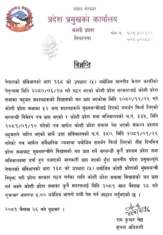 कोशी प्रदेशका प्रदेश प्रमुख पर्शुराम खापुङले हिजो बैशाख २६ गते एक बिज्ञप्ति जारी गरि प्रदेश सरकार गठन गर्नका लागि कोशी प्रदेश सभामा बिश्वासको मत प्राप्त गर्न सक्ने प्रदेश सभाका कुनै सदस्यलाई २०८१ बैशाख २८ गते शुक्रबार ५ बजे भित्र दाबी पेश गर्न आव्हान गरे सगै सरकार परिवर्तनको प्रक्रिया सुरु भएको हो ।